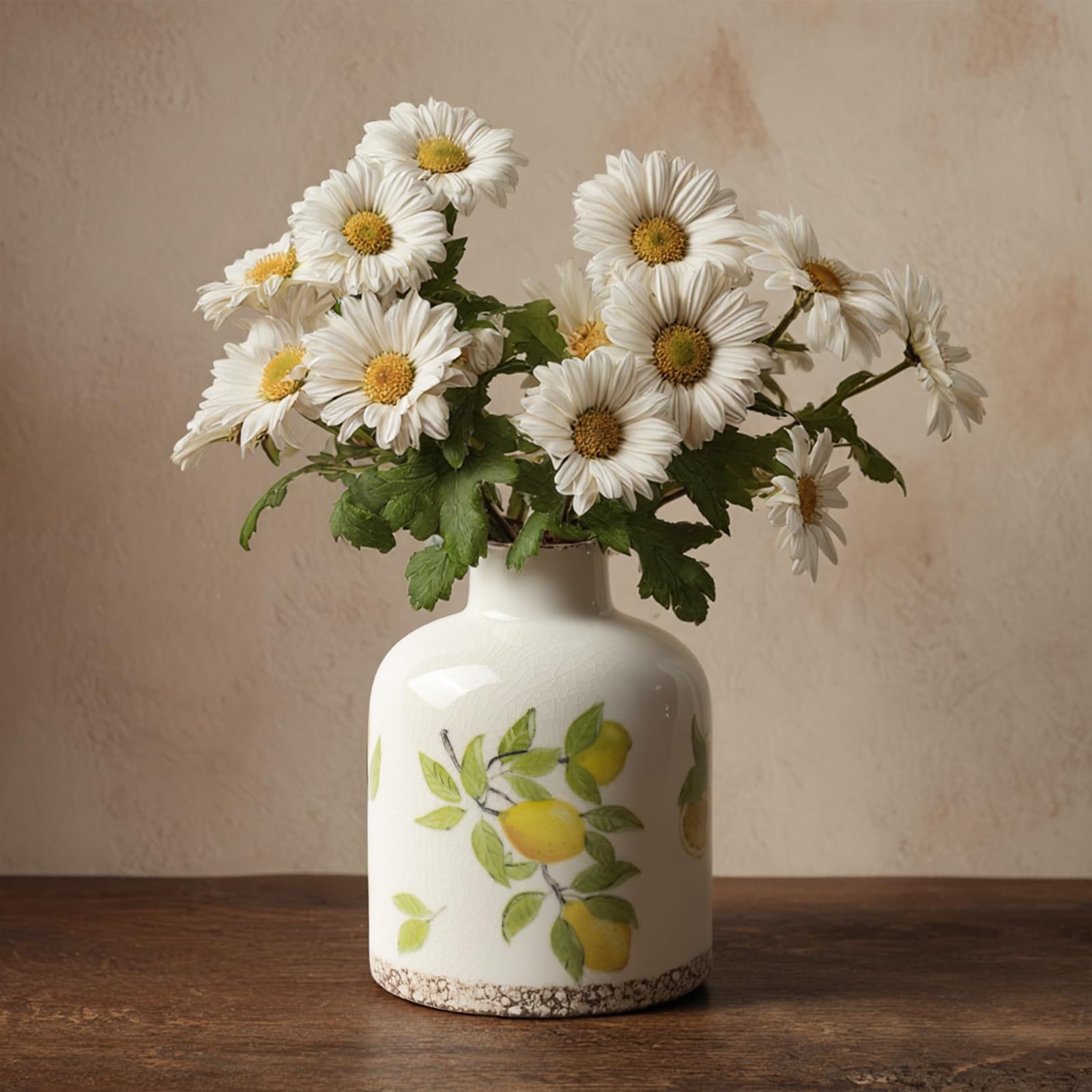 The vase has a charming farmhouse vibe. The crackled glaze and lemon print make it feel handcrafted and unique on a shelf or table.