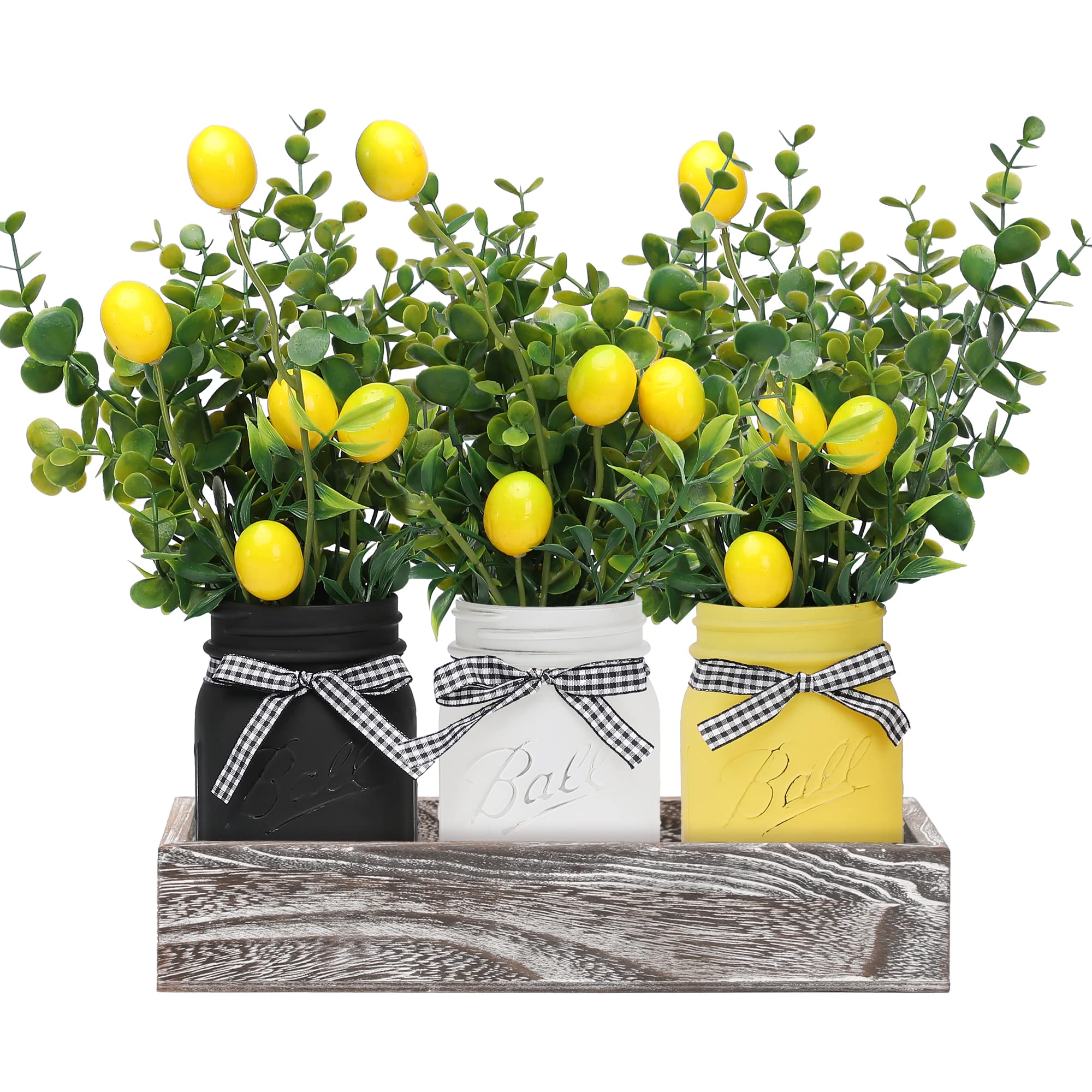 This set comes with three mason jars, each decorated with artificial lemons and leaves. The frosted texture and rope around the neck fit right in with a farmhouse or rustic style. Besides being a pretty centerpiece, you can use them to hold utensils or other small things. The wooden tray keeps the jars together or can hold other decorations if you want to change things up.